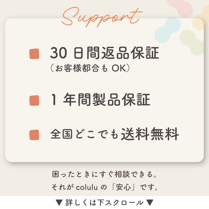 また、製造過程での不具合による故障や損傷、または通常の使用において発生した故障により商品がご利用いただけなくなった場合は1年間の保証が適用され、状況を確認したうえで、速やかに交換または返金にて対応いたします。