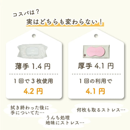 匿名 普段は格安ペラペラのおしりふきを使っていましたが、これを使用してからはペラペラのおしりふきには戻れなくなりました。これだと1、2枚でキレイになります!割高かな?と思っておりましたが、ペラペラを7、8枚使う事を考えるとこっちのおしりふき1、2枚のがお得な気がします!