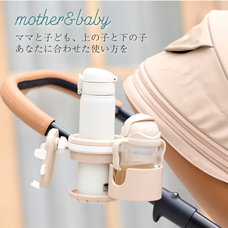 - 2か所のドリンクホルダーで赤ちゃんマグとママの水筒を置くことが可能。