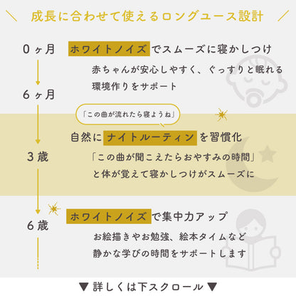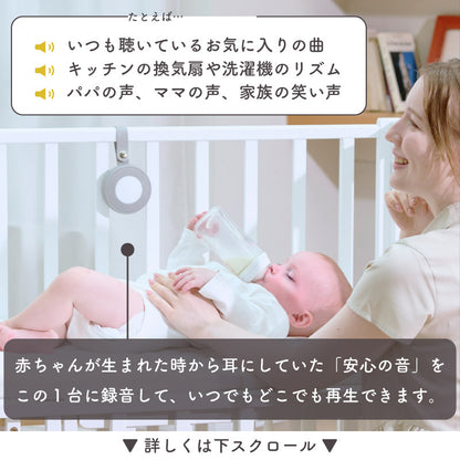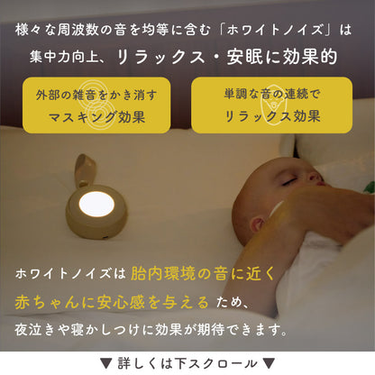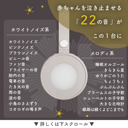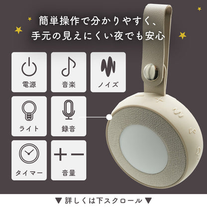 | 機能 | 音源:ホワイトノイズ/ 自然音など (計13種) +童謡 (9曲) 全22種 タイマー設定:15分/30分/60分/設定なし ※最後の1分間徐々に音楽が小さくなり LEDも消灯されて終了します メモリー機能:電源を切る前の音源、音量、ライトの明るさを記憶し、次回起動時に自動で反映されます 音量:30段階調整(最小は無音)、最大音時70dB LEDライト:ウォームホワイト+明るさ調整可能(本体OFF時でも操作可能) 録音機能:最大3分録音可能 ※再録音すると前回の録音音源はリセットされます チャイルドロック:電源ON/OFFの際に電源ボタンを含む全ボタンをロック 残量インジケータ:バッテリー残量が約15%以下になるとランプが赤色スロー点滅 ※表示は目安であり、正確なバッテリー残量を示すものではありません |