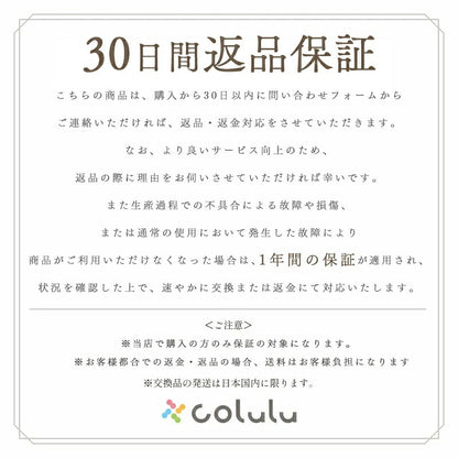 - 製造過程での不具合による故障や損傷、または通常の使用において発生した故障により商品がご利用いただけなくなった場合は1年間の保証が適用され、状況を確認したうえで、速やかに交換または返金にて対応いたします。