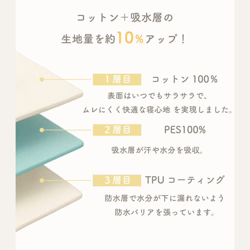 | 素材・仕様 | パイル部分:綿100%(吸水・肌ざわり◎) 基布部分:ポリエステル100% 裏面:ポリウレタンコーティング(高い防水性と耐久性) 原産国:中国 |